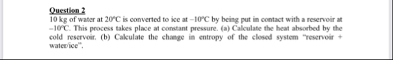 10 kg of water at 20°C is converted to ice at -10°C by being put in contact with a reservoir at -10°C. This process takes place at constant pressure. (a) Calculate the heat absorbed by the cold reservoir. (b) Calculate the change in entropy of the closed system “reservoir water/ice”.