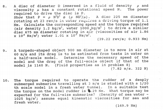 This fluid mechanics problem evaluates the power and torque needed to rotate a disc in air based on a water model test. By applying dynamic similarity and maintaining equal Reynolds numbers, the conditions in two different fluids are made equivalent. This helps engineers accurately predict full-scale behavior without full-scale testing.