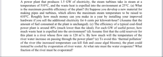 A power plant that produces 1.5 GW of electricity, the steam turbines take in steam at a temperature of 510°C, and the waste heat is expelled into the environment at 25°C. (a) What is the maximum possible efficiency of the plant? (b) Suppose you develop a new material for making pipes and turbines, which allows the maximum steam temperature to be raised to 610°C. Roughly how much money can you make in a year by installing your improved hardware if you sell the additional electricity for 6 cents per kilowatt-hour? (Assume that the amount of fuel consumed at the plant is unchanged). (c) The efficiency of a typical coal-fired power plant is around 40% (much lower than the ideal). For each GW of useful power, how much waste heat is expelled into the environment? (d) Assume first that the cold reservoir for this plant is a river whose flow rate is 120m3s. By how much will the temperature of the river water increase on passing through the power plant? (e) To avoid this ‘thermal pollution’ of the river (the increased temperature can kill fish and cause algal blooms), the plant could instead be cooled by evaporation of river water. At what rate must the water evaporate? What fraction of the river must be evaporated?