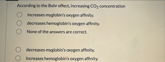 According to the Bohr effect, increasing CO2 concentration increases myglobin’s oxygen affinity.decreases hemoglobin’s oxygen affinity.None of the