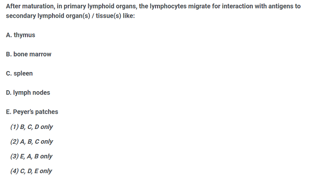 After maturation, in primary lymphoid organs, thelymphocytes migrate for interaction with antigens tosecondary lymphoid organ(s)/tissue(s) like:A. thymusB. bone marrowC. spleenD. lymph nodesE. Peyer’s patchesChoose the correct answer from the options givenbelow: