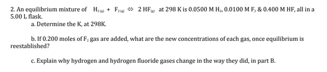 An equilibrium mixture of H_(2(g))+F_(2(g))<=>2HF_((g)) at 298 K is 0.0500MH_(2),0.0100MF_(2)&0.400MHF, all in a 5.00 L flask. a. Determine the