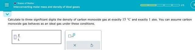 Calculate to three significant digits the density of carbon monoxide gas at exactly 15∘C and exactly 1 atm. You can assume carbon monoxide gas