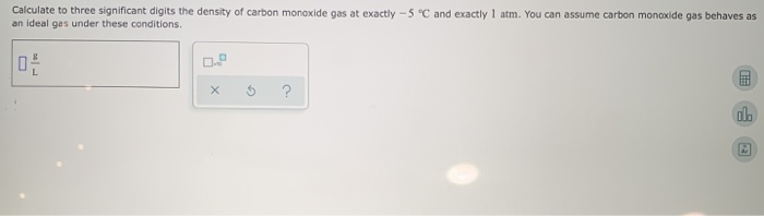 Calculate to three significant digits the density of carbon monoxide gas at exactly -5 °C and exactly 1 atm. You can assume carbon monoxide gas
