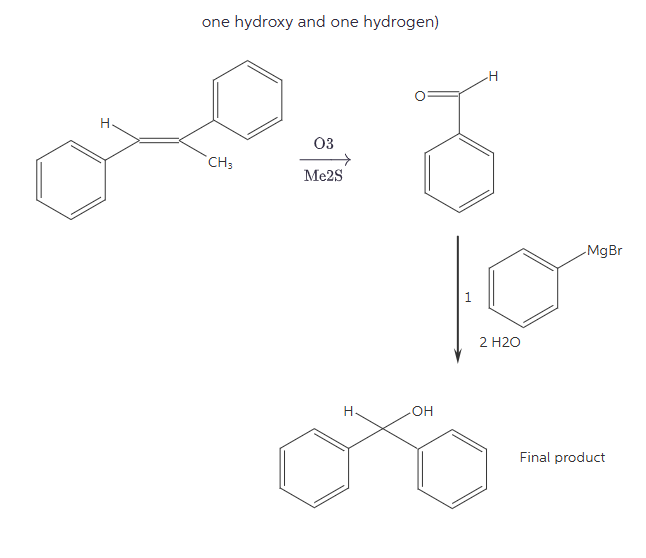- Grignard Reaction: PhMgBr adds to benzaldehyde, followed by hydrolysis (HβO), yielding a secondary alcohol.