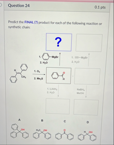 Choose the correct chemical structure for every single acronym used below: A B C DQuestion 2 4 0 . 1 pts Predict the FINAL ( ? ) product for each of the following reaction or synthetic chain: 4 1 . – = M g B r H 2 O H 2 O β 2 . M e 2 S 1 . O 3 L i A l H 4 N a B H 4 H 2 O MeOH A B C D