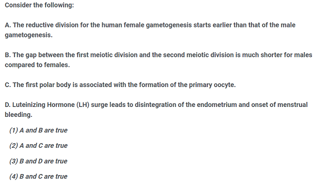 Consider the following:A. The reductive division for the human femalegametogenesis starts earlier than that of themale gametogenesis.B. The gap between the first meiotic division andthe second meiotic division is much shorter formales compared to females.C. The first polar body is associated with theformation of the primary oocyte.D. Luteinizing Hormone (LH) surge leads todisintegration of the endometrium and onset ofmenstrual bleeding.Choose the correct answer from the options givenbelow