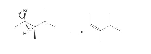 Important: For E2 elimination to proceed, the leaving group (Br) and the β-hydrogen must be anti-periplanar—that is, on opposite sides of the same plane.