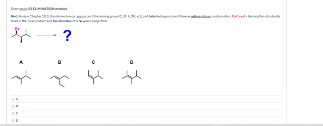 Draw major E2 ELIMINATION product. bond in the final product and the direction of a Newman projection: A B C D