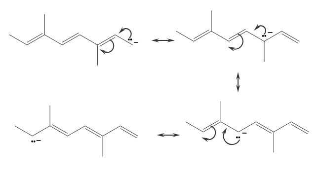 The newly formed carbanion (with a lone pair) can push electrons further along the π-system, continuing the delocalization process. This may lead to a series of resonance structures that shift the negative charge through the molecule.