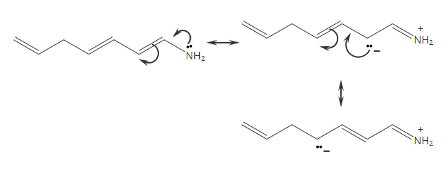 A lone pair on nitrogen forms a double bond with an adjacent carbon. The adjacent π bond shifts, creating a new location for the electron density. A formal charge appears on the nitrogen (+) and possibly a negative charge at the end of the conjugation path.