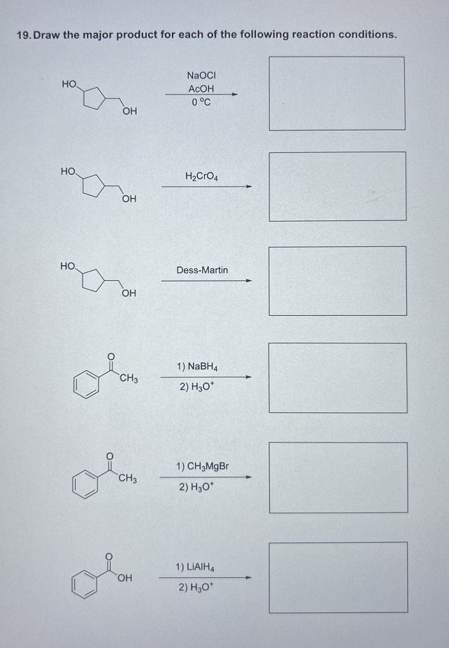 This guide summarizes the expected major product for each step involving oxidation and reduction of organic functional groups. The reagents used target specific types of alcohols, ketones, or acids and transform them into more oxidized or reduced forms.