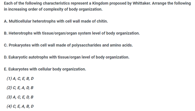 Each of the following characteristics represent aKingdom proposed by Whittaker. Arrange thefollowing in increasing order of complexity of bodyorganization.A. Multicellular heterotrophs with cell wall madeof chitin.B. Heterotrophs with tissue/organ/organ systemlevel of body organization.C. Prokaryotes with cell wall made ofpolysaccharides and amino acids.D. Eukaryotic autotrophs with tissue/organ levelof body organization.E. Eukaryotes with cellular body organization.Choose the correct answer from the options givenbelow: