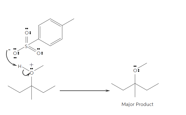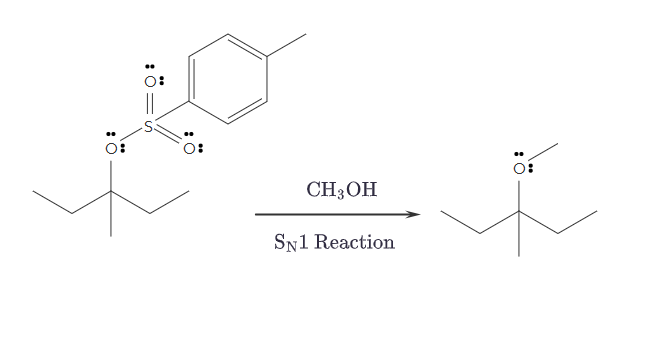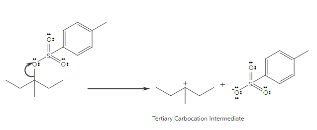 The leaving group (such as OTs⁻) departs from the substrate molecule. This results in the formation of a tertiary carbocation, where the positively charged carbon is bonded to three alkyl groups.