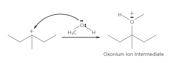 The nucleophile (e.g., CH₃OH) attacks the positively charged carbon atom (the carbocation). This leads to the formation of an oxonium ion intermediate (a positively charged oxygen species).