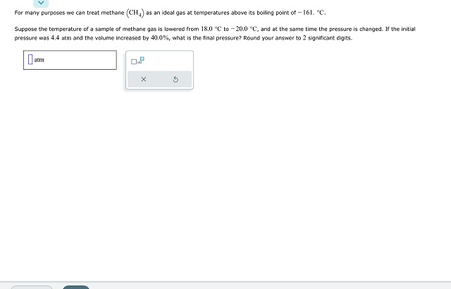 For many purposes, we can treat methane (CH4) as an ideal gas at temperatures above its boiling point of −161.∘C. Suppose the temperature of