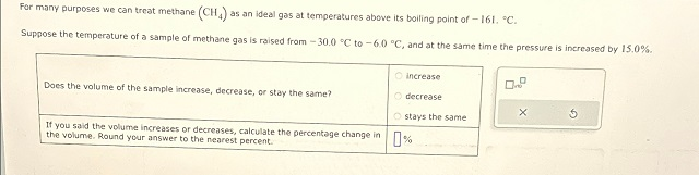 For many purposes, we can treat methane (CH4) as an ideal gas at temperatures above its boiling point of -161.°C. Suppose the temperature of a