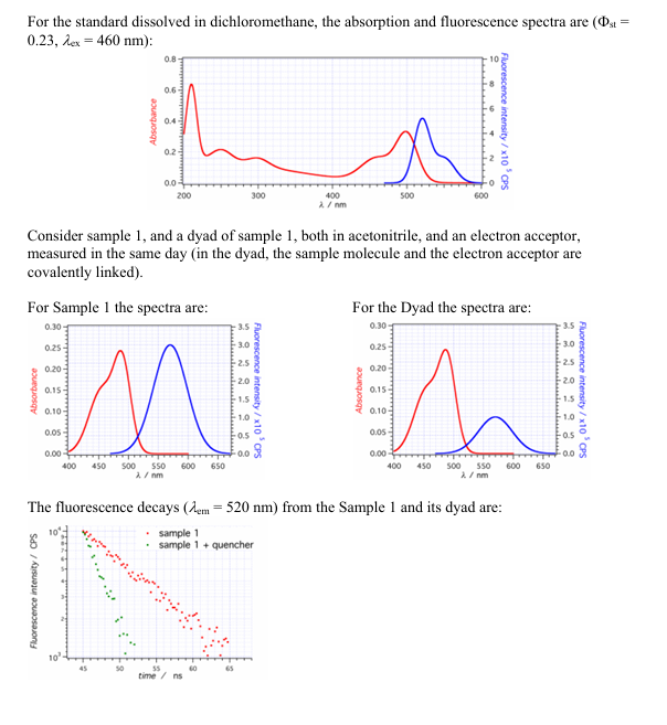 For the standard dissolved in dichloromethane, the absorption and fluorescence spectra are 0.23,λex =460∩.Consider sample 1, and a dyad of