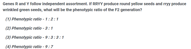 Genes R and Y follow independent assortment. IfRRYY produce round yellow seeds and rryyproduce wrinkled green seeds, what will be thephenotypic ratio of the F2 generation?