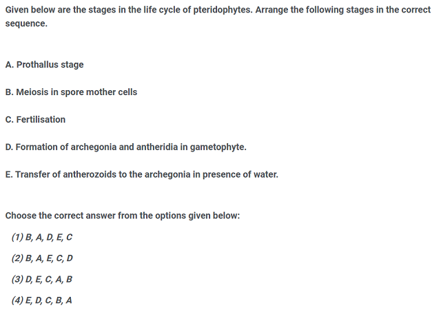 Given below are the stages in the life cycle ofpteridophytes. Arrange the following stages in thecorrect sequence.A. Prothallus stageB. Meiosis in spore mother cellsC. FertilisationD. Formation of archegonia and antheridia ingametophyte.E. Transfer of antherozoids to the archegonia inpresence of water.Choose the correct answer from the options givenbelow: