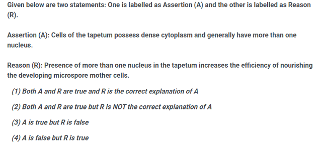 Given below are two statements : one is labelled asAssertion (A) and the other is labelled as Reason(R).Assertion (A): Cells of the tapetum possess densecytoplasm and generally have more than onenucleus.Reason (R): Presence of more than one nucleus inthe tapetum increases the efficiency of nourishingthe developing microspore mother cells.In the light of the above statements, choose the mostappropriate answer from the options given below: