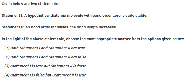 Given below are two statements : Statement I: A hypothetical diatomic moleculewith bond order zero is quite stable.Statement II: As bond order increases, the bondlength increases.In the light of the above statements
