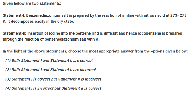 - Statement I: True – Benzenediazonium salt is unstable and explosive in dry form.