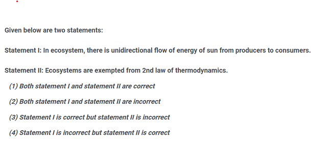| Statement II | ❌ Incorrect | Ecosystems obey the second law of thermodynamics and require continuous energy input to maintain order. |