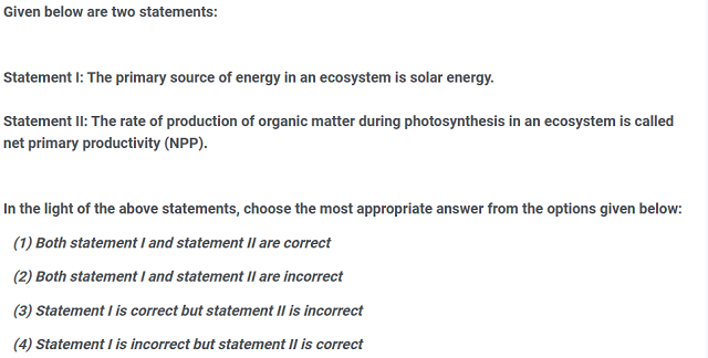 Given below are two statements Statement I: The primary source of energy in anecosystem is solar energy.Statement II: The rate of production of organicmatter during photosynthesis in an ecosystem iscalled net primary productivity (NPP).In the light of the above statements, choose themost appropriate answer from the options given below