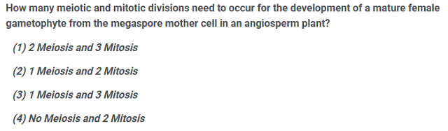 How many meiotic and mitotic divisions need tooccur for the development of a mature femalegametophyte from the megaspore mother cell in anangiosperm plant?