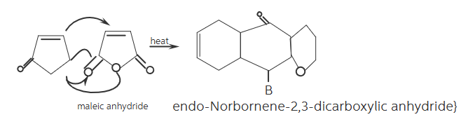 The Diels–Alder reaction between cyclopentadiene and maleic anhydride under heat results in the formation of endo-Norbornene-2,3-dicarboxylic anhydride as the major product. The stereoselectivity is driven by orbital interactions and the reactivity of the electron-deficient dienophile.