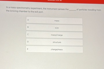 In a mass spectrometry experiment, the instrument senses the the ionizing chamber to the exit port. of particles traveling from A mass B size C mass / charge D structure E charge / mass