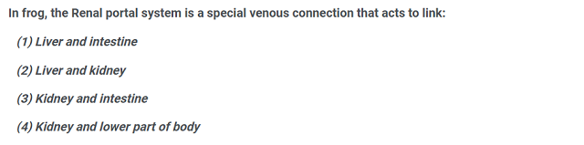 The renal portal system in frogs is a specialized venous connection that links the kidney and the lower part of the body. This system is designed to carry blood from the posterior parts of the body (such as the hindlimbs and tail) to the kidneys before the blood returns to the heart. This serves as a functional adaptation, allowing blood to be filtered by the kidneys before re-entering systemic circulation. The renal portal system is unique to amphibians and some reptiles and plays a crucial role in waste filtration and osmoregulation.