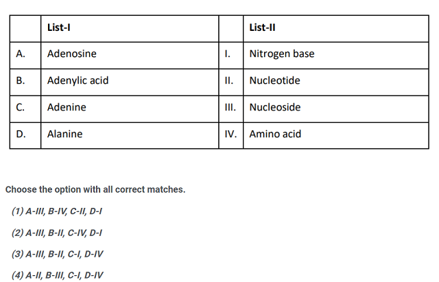 Match List I with List II.List I List IIA. Adenosine I. Nitrogen baseB. Adenylic acid II. NucleotideC. Adenine III. NucleosideD. Alanine IV. Amino acidChoose the option with all correct matches.