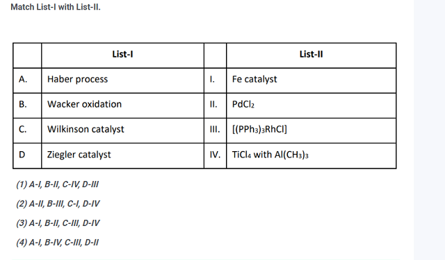 Match List-I with List-II.List-I List-IIA. Haber process I. Fe catalystB. WackeroxidationII. PdCl2C. WilkinsoncatalystIII. [(PPh3)3RhCl]D. ZieglercatalystIV. TiCl4 with Al(CH3)3Choose the correct answer from the options givenbelow: