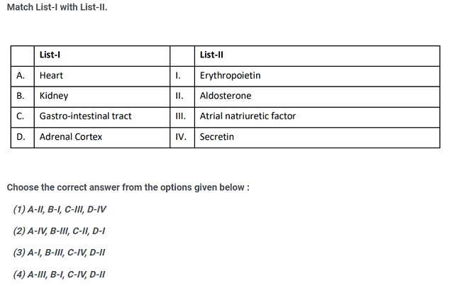 Match List – I with List – II.List – I List – IIA. Heart I. Erythropoietin B. Kidney II. AldosteroneC. Gastro-intestinal III. Atrial natriuretictracts factorD. Adrenal Cortex IV. SecretinChoose the correct answer from the options givenbelow: