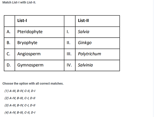Match List-I with List-II.List-I List-IIA. Pteridophyte I. SalviaB. Bryophyte II. GinkgoC. Angiosperm III. PolytrichumD. Gymnosperm IV. SalviniaChoose the option with all correct matches.