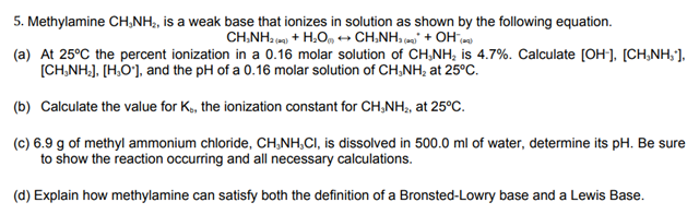 Given: 0.16 M CH₃NH₂, 4.7% ionized at 25°C
