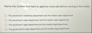 Name two bodies that have to approve most ads before running in the media. The advertiser’s marketing department and the media’s sales department The advertiser’s sales department and the media’s sales department The advertiser’s legal department and the media’s legal department The government’s legal department and the media’s legal department