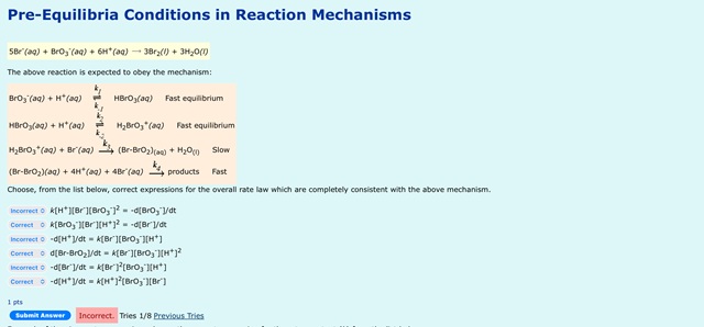 Pre-Equilibria Conditions in Reaction Mechanisms5Br-(aq)+BrO3-(aq)+6H+(aq)longrightarrow3Br2(I)+3H2O(I)The above reaction is expected to