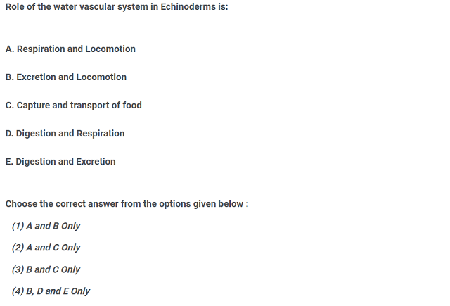 Role of the water vascular system in Echinodermsis:A. Respiration and LocomotionB. Excretion and LocomotionC. Capture and transport of foodD. Digestion and RespirationE. Digestion and ExcretionChoose the correct answer from the options givenbelow