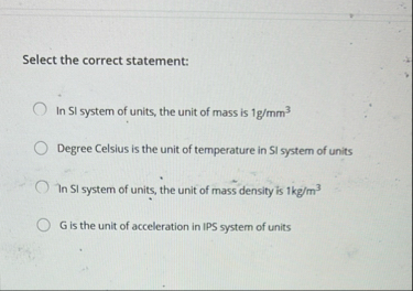 1. Incorrect: In SI system of units, the unit of mass is \( \frac{1\text{g}}{\text{m} \cdot \text{m}^3} \)
