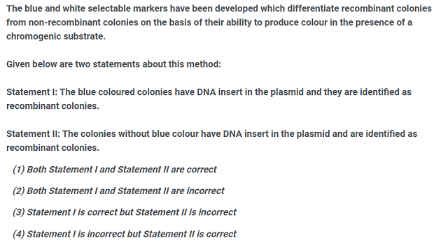 - Statement I: Blue colonies have DNA insert and are recombinant → Incorrect