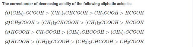 Order of acidity: HCOOH > CH₃COOH > (CH₃)₂CHCOOH > (CH₃)₃CCOOH
