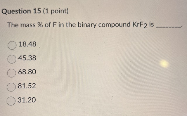 The mass of F in the binary compound KrF2 is 18.4845.3868.8081.5231.20
