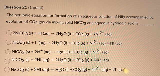 NiCO₃reacts with2H⁺to produceNi²⁺,CO₂(g), andH₂O(l)I⁻is a spectator ion and does not appear in the net ionic equation
