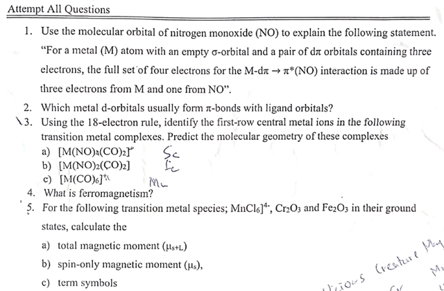 Use the molecular orbital of nitrogen monoxide (NO) to explain the following statement.”For a metal (M) atom with