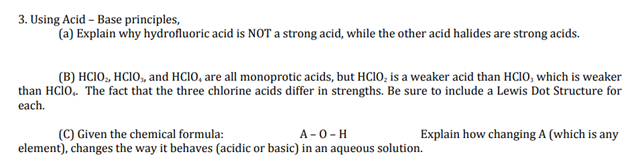 Using Acid – Base principles, (a) Explain why hydrofluoric acid is NOT a strong acid, while the other acid halides are strong acids. (B)
