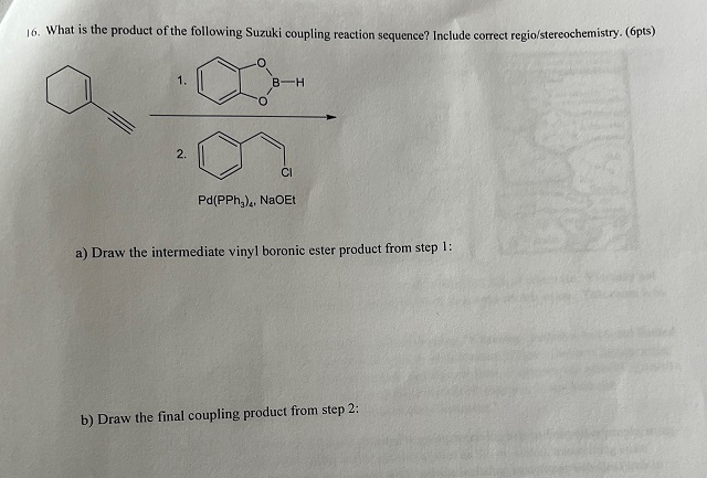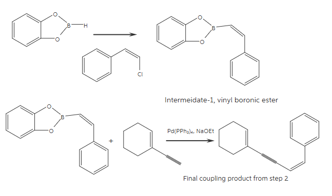 In the provided reaction, a vinyl boronic ester couples with a vinyl halide under the influence of