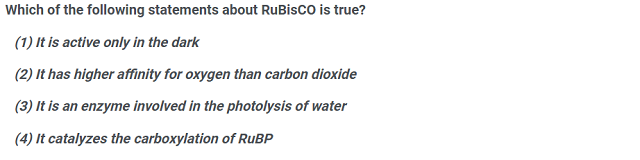 - “It is an enzyme involved in the photolysis of water” โ Photolysis is part of the light-dependent reactions and is performed by Photosystem II, not RuBisCO.